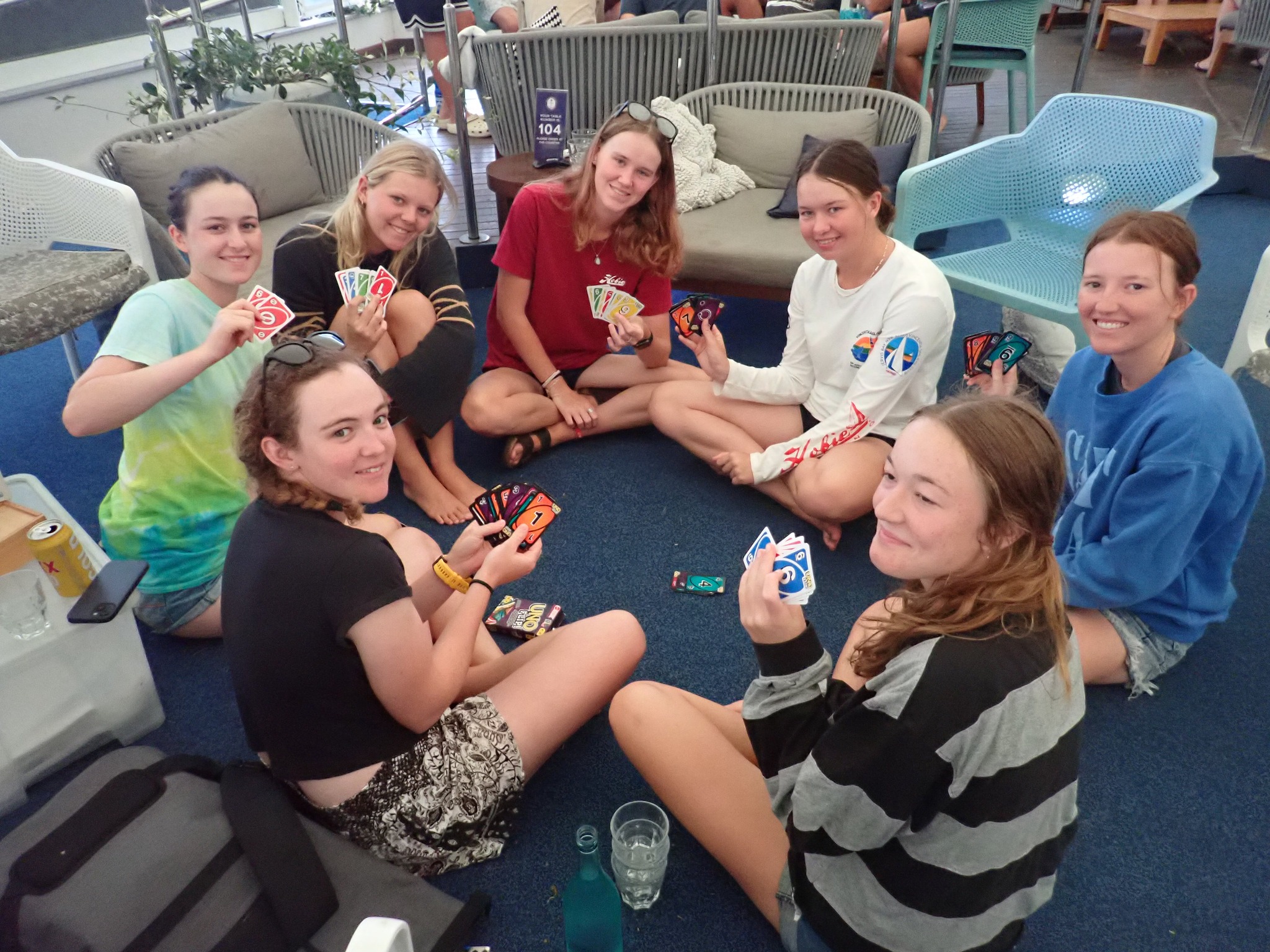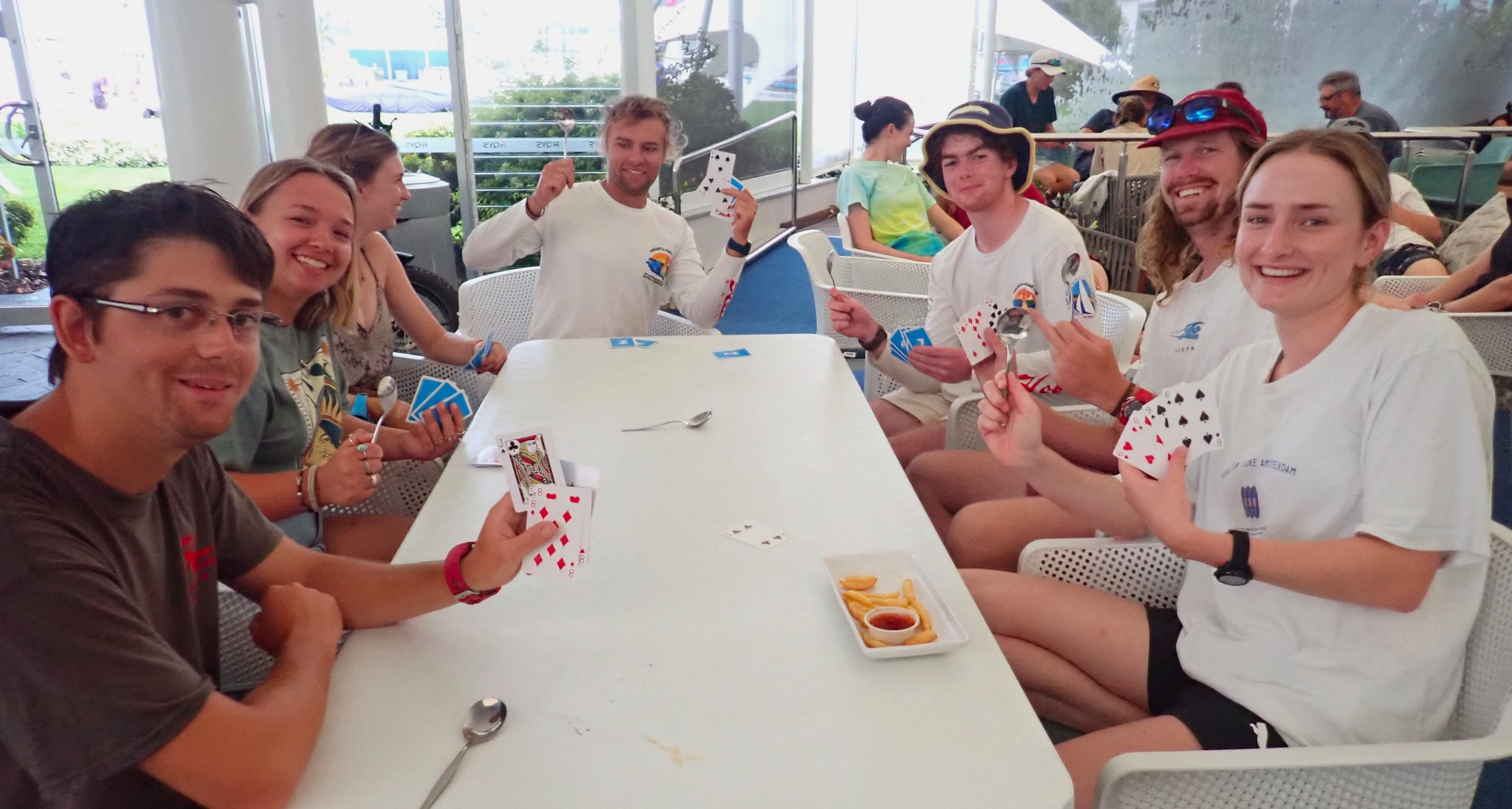 With similar conditions to the previous day, and a even slower start to morning, the ‘hurry up & wait protocol’ was enacted by the race committee. The young guns of the Hobie family spent the morning relieving the days of yore, playing Finska on the luscious lawn of RQYS, whilst the more experienced generation conserved their energy in the air-conditioning. However, as the breeze began to fill by the early afternoon, it was action stations as the fleet hit Moreton Bay for three red-hot races.