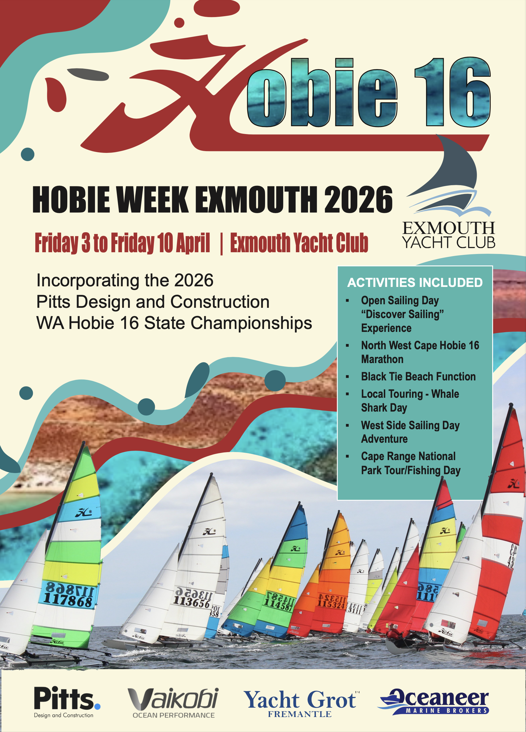 - Saturday 4 and Sunday 5 April – Pitts Design and Construction WA Hobie 16 State Championships.