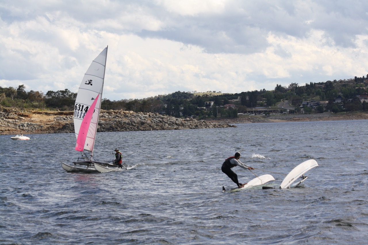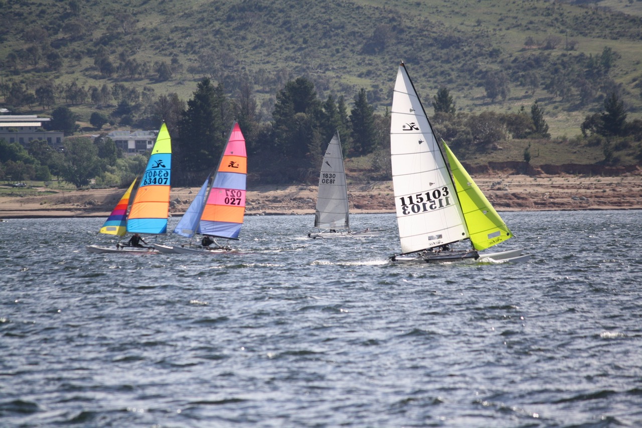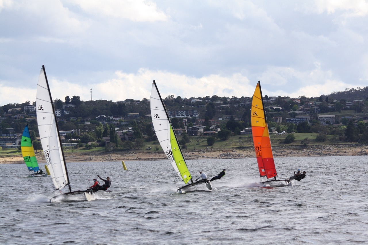 Late Sunday afternoon, as a fleet of over 70 boats-worth congregated in and around Lake Jindabyne Sailing Club’s main clubhouse looking out over one of the most picturesque destinations for Hobie Cat sailing I’ve seen in a long time; Mads & Zac stated the most simplest of facts that summed up the whole weekend: “Jindabyne, more like Windabyne”.