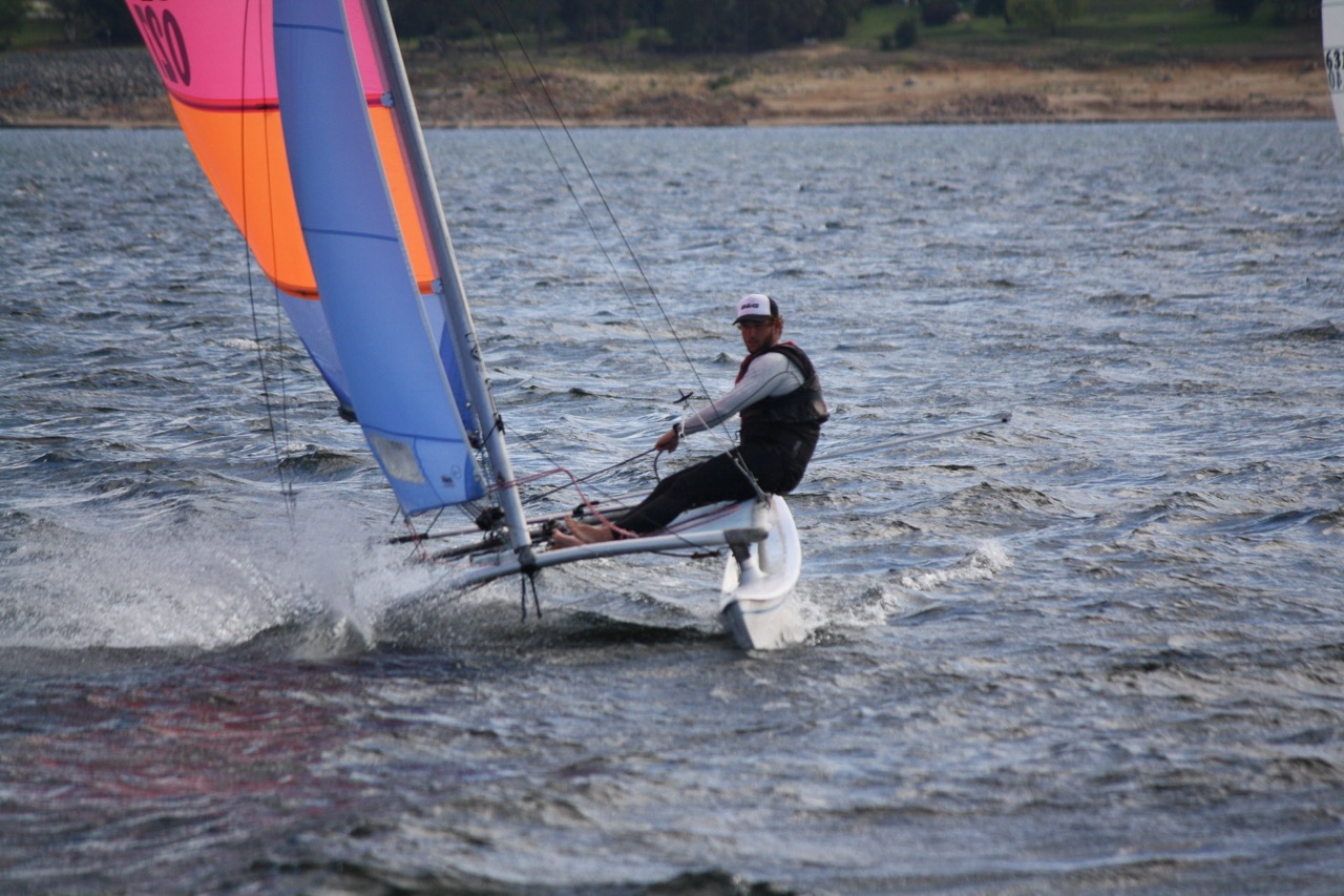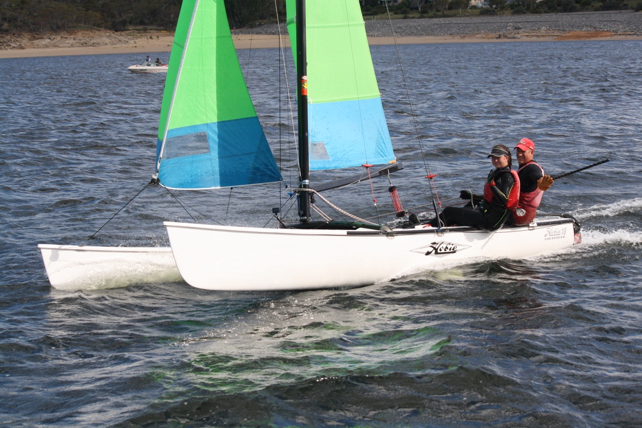 Six Hobie 14-Turbos, seven 18s and seven 16s hit the race track over the weekend alongside an assortment of other off-the-beach craft for six races in some of the trickiest, yet entertaining, racing we’ve had for a long time. The first race of the series took place at 6pm and went for no more than 15 minutes, with Fletch & Georgia claiming the prize as myself & Elsa snuck in just behind. In the Hobie 14-Turbos, Darren Schmidt took home bragging rights whilst Jake & Alannah had the honour of wearing the yellow jerseys on day two, which they politely declined.